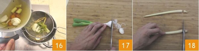 Una vez cocido, cuela el caldo de verduras y lemongrass y resérvalo 16. Pasa ahora a la preparación de la salsa. Limpia la cebolleta y córtala en rodajas finas 17, luego limpia el lemongrass 18.