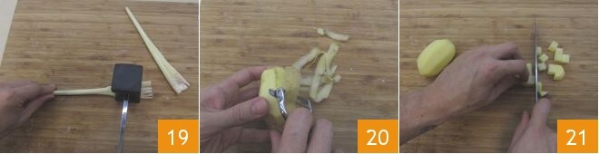 Y májalo con un mortero, para liberar su aroma 19. Pela las patatas 20 y córtalas en pequeños cubos 21.