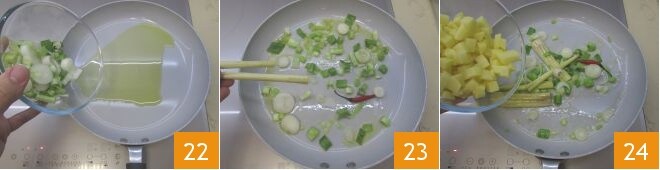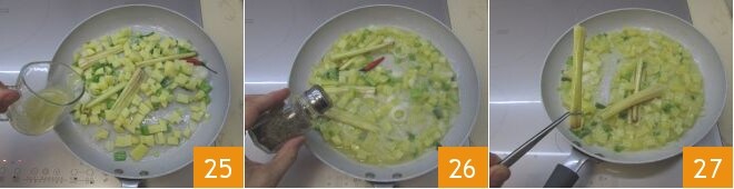 Coloca en una sartén un chorrito de aceite, añade la cebolleta 22 y deja que se dore a fuego lento. Añade también un chile entero, el lemongrass majado 23 y los cubos de patata 24.