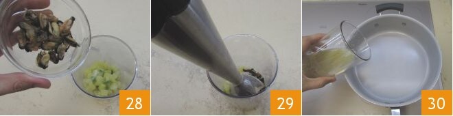 Transfiere las patatas al vaso de la batidora y añade unos 30 g de mejillones sin concha 28. Tritura cuidadosamente 29 para obtener una salsa lisa, y resérvala. Pasa ahora a la parte final de la receta, la cocción tipo risotto de la pasta. Humedece con un poco de caldo de verduras el fondo de una cazuela 30.