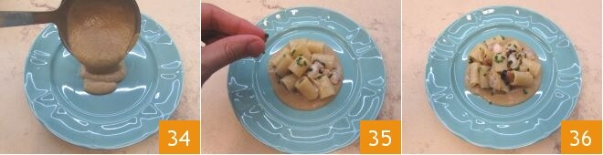 Procede a emplatar: distribuye en cada plato la crema de lemongrass 34, coloca encima la pasta y espolvorea con cebollino picado 35. ¡Tus tiburoncitos con salsa al lemongrass están listos para disfrutarse 36!
