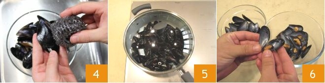 Con una esponja de acero frota los mejillones para eliminar cualquier otra impureza 4. Escurre los mejillones limpios, sécalos, colócalos en una cazuela donde habrás calentado un chorrito de aceite y medio diente de ajo entero y cubre con una tapa 5. Deja cocinar a fuego alto durante unos 5 minutos, hasta que los mejillones se hayan abierto por completo. Déjalos enfriar un poco antes de proceder a quitarlos de las conchas 6, y guarda el líquido que hayan producido durante la cocción.