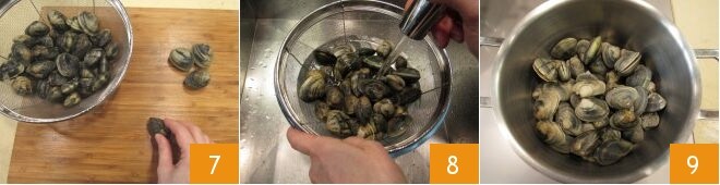 Pasa a las almejas: primero selecciona las almejas, eliminando las abiertas o rotas. Luego golpea cada almeja sobre una superficie (por ejemplo, una tabla de cortar) 7, para que pierdan un poco de arena e impurezas. Ponlas en un colador apoyado sobre un recipiente (asegúrate de que no toque el fondo) y enjuágalas varias veces bajo agua corriente 8. Puedes dejarlas en remojo durante algunos minutos, luego cambiar el agua varias veces, hasta que en el fondo del recipiente no haya más residuos de arena. Luego calienta en una cazuela un chorrito de aceite con medio diente de ajo, y vierte las almejas escurridas 9.