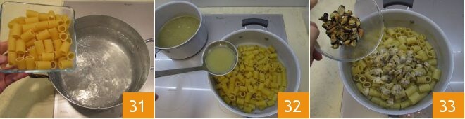 Y luego añade la pasta 31. Cocina la pasta, añadiendo caldo cada vez que la pasta absorba completamente el anterior 32. Añade, casi al final de la cocción, las almejas y los mejillones sin concha 33.