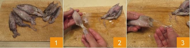 Para preparar las penne integrales con calamares al vino blanco, primero comenzad a Cómo limpiar los calamares 1: después de haberlos enjuagado cuidadosamente bajo agua fría, separad delicadamente la cabeza del manto 2 y reservadla. Una vez extraída la cabeza, buscad la pluma de cartílago transparente que se encuentra en el manto y retíradla con cuidado 3,