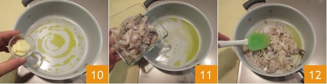 y mientras tanto calentad el ajo en una sartén con un poco de aceite de oliva virgen extra 10. Una vez dorado, retiradlo y saltead los calamares en la sartén 11, durante dos minutos, mezclándolos de vez en cuando 12 para dorarlos uniformemente.