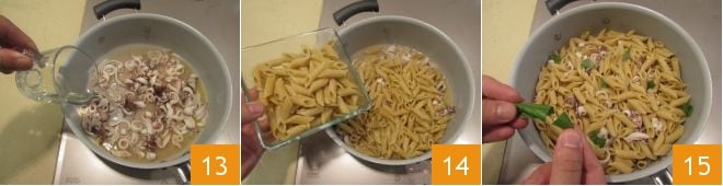 Rociad todo con el vino blanco 13 y una vez evaporado, añadid la pasta al dente 14 y dejad que se impregne con los calamares durante 3-4 minutos. Tomad la albahaca y cortadla con las manos 15,