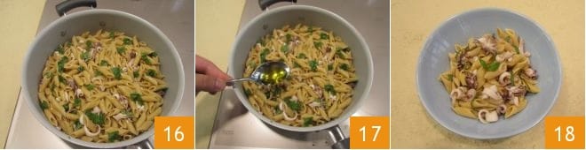 añadidla en la sartén 15 y finalmente sazonad todo con una cucharada de aceite de oliva virgen extra 16. ¡Vuestras penne integrales con calamares al vino blanco están listas para ser servidas!