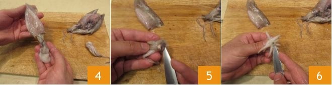 luego eliminad las vísceras 4 y enjuagad el manto cuidadosamente por dentro. Luego extraed los ojos de la cabeza, con la ayuda de un cuchillo 5 y repetid la misma operación también con el pico 6 que se encuentra en el centro de los tentáculos,