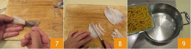 quitad la piel de los tentáculos y del manto 7. Enjuagad bien todas las partes del calamar bajo agua corriente; luego proceded a cortar en tiras el manto 8 y los tentáculos; entonces reservad. En una olla grande, hervid agua salada al gusto y poned a cocer la pasta 9,