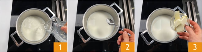 Para preparar el migliaccio de chocolate, en una cacerola calienta la leche, el agua 1, la sal 2 y la mantequilla 3.