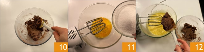 Mezcla y reserva 10. En un recipiente muy grande, bate con las varillas eléctricas los huevos con el azúcar 11 durante unos minutos hasta que estén un poco más esponjosos. Luego, añade la mezcla de ricota y cacao 12.