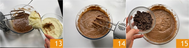 Después, incorpora la sémola templada 13 y sigue mezclando con las varillas 14. Finalmente, añade el chocolate picado 15.