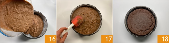 Mezcla y transfiere a un molde de 24 cm enmantecado y forrado con papel de horno 16. Nivela la superficie con la espátula 17 y hornea en horno estático precalentado a 180° durante unos 80 minutos. Deja enfriar 18 completamente antes de colocarlo en la nevera por un par de horas más y luego sirve.