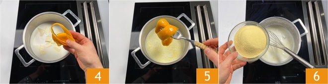 Sazona con la cáscara de naranja 4. Lleva a ebullición a fuego medio-alto. Una vez que haya hervido, retira la cáscara de los líquidos 5 y añade la sémola en forma de lluvia 6. Remueve con el batidor para evitar grumos y cocina a fuego medio durante 3-4 minutos.