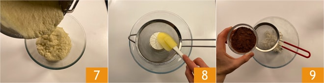 Transfiere la mezcla a un bol 7, cubre con film y deja que se temple. Mientras tanto, tamiza la ricota 8 y añade el cacao 9.