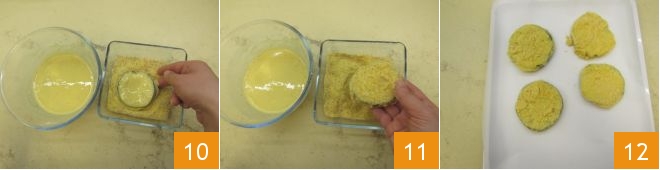 y luego en la mezcla de pan rallado y harina de maíz 10 primero por un lado y luego por el otro 11. Haced lo mismo con 4 rodajas de berenjena, teniendo cuidado, después de empanar cada rodaja, de colocarlas suavemente sobre un plato donde hayáis puesto papel de horno 12.