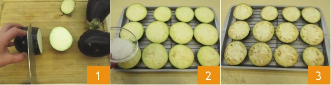 Para preparar las milanesas de berenjena, comenzad por la preparación de las berenjenas: lavadlas, cortadles los extremos de ambos lados y cortadlas en rodajas de aproximadamente 1,5 cm de grosor, hasta obtener 12 rodajas. 1. Disponed todas las rodajas sobre una rejilla y espolvoread cada rodaja con sal gruesa 2. Dejadlas reposar, a temperatura ambiente, durante aproximadamente una hora 3. Para esta fase es recomendable no dejar reposar las berenjenas por más de una hora y media, de lo contrario absorberán demasiada sal.