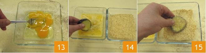 Ahora pasad al segundo rebozado, el clásico: en un bol batid un huevo 13 y salpimentadlo ligeramente, luego proceded a empanar una rodaja de berenjena a la vez, sumergiéndola primero en el huevo batido 14 y luego en el pan rallado 15.