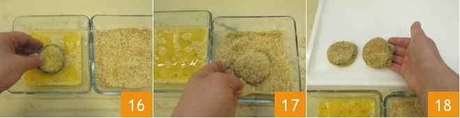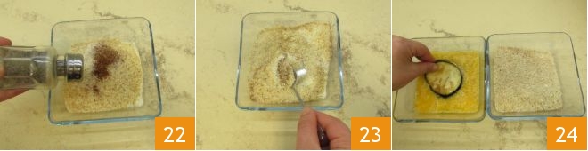 Repetid la operación para hacer el doble rebozado: después de haber pasado la rodaja en el pan rallado, volved a sumergirla en el huevo 16, y luego de nuevo en el pan rallado 17. Haced lo mismo hasta obtener 4 rodajas de berenjena, que colocaréis en el plato con el papel de horno 18.