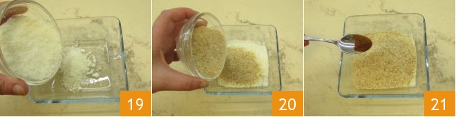 Pasad al tercer rebozado: en un bol verted el Pecorino 19 y mezcladlo con el pan rallado 20. Añadid el pimentón dulce ahumado 21