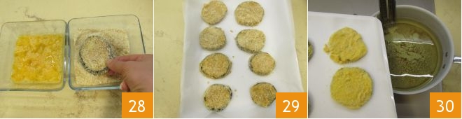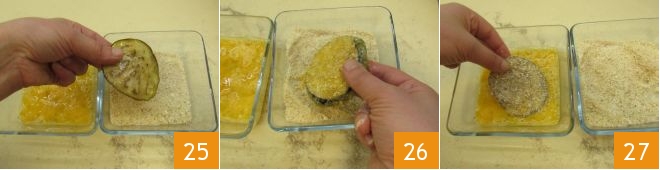 y luego en la mezcla de pan rallado y Pecorino 25 primero por un lado y luego por el otro 26. También en este caso se hará un doble rebozado: volved a sumergir la berenjena en el huevo 27