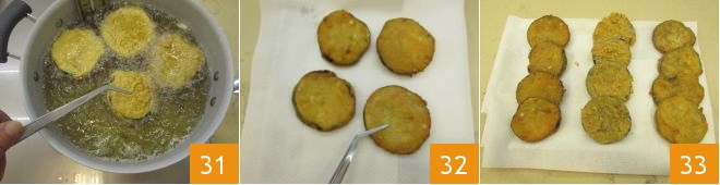 Sumergid las berenjenas en el aceite de cuatro en cuatro, friéndolas durante 2-3 minutos y girándolas bien por ambos lados con la ayuda de unas pinzas 31. Una vez que estén perfectamente doradas, colocadlas sobre un plato con papel de cocina, para que pierdan el exceso de aceite 32. Continuad friendo todas las demás rodajas de berenjena, las que tienen el rebozado clásico y las del Pecorino: todas tienen el mismo tiempo de cocción. Disponedlas en un plato, manteniéndolas separadas por tipo de rebozado 33 y servidlas. ¡Vuestras milanesas de berenjena están listas para ser degustadas!