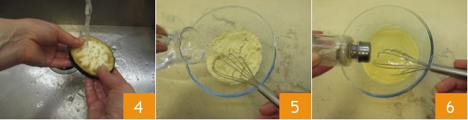 Pasado este tiempo, lavad bien cada rodaja bajo el agua corriente para quitar el exceso de sal 4 y secadlas bien con un paño limpio o papel de cocina. Luego, poned a calentar el aceite de semillas en un cazo, con el termómetro de cocina, y empezad a preparar el rebozado vegano: verted en un bol la harina de garbanzo y agregad el agua poco a poco, mezclando con un batidor para evitar la formación de grumos 5. Salpimentad ligeramente y mezclad de nuevo 6.