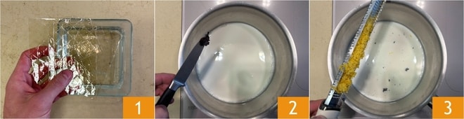 Para preparar el milhojas con frutos del bosque, comenzad con la crema pastelera, uno de los elementos de la crema diplomática: poned la gelatina en un bol con agua fría 1 y dejadla en remojo durante unos diez minutos. Mientras tanto, calentad la leche en un cazo, aromatizándola con las semillas de la vaina de vainilla 2 y la cáscara rallada del limón 3; deberá llegar a casi hervir.