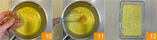 Cuando la crema se haya espesado, apagad el fuego e incorporad la gelatina bien escurrida 10. Mezclad bien para integrarla de manera uniforme 11, luego transferid la crema a una fuente, cubrid con film en contacto y dejad enfriar completamente 12.