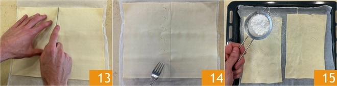 Mientras la crema se enfría, ocupáos del hojaldre: extendéd el rollo sobre la superficie de trabajo y divididlo en 2 rectángulos 13, luego pinchad con un tenedor 14. Transferid las láminas a una bandeja para hornear con su papel de horno y espolvoread toda la superficie con azúcar glas 15.