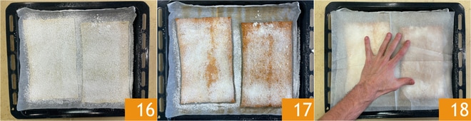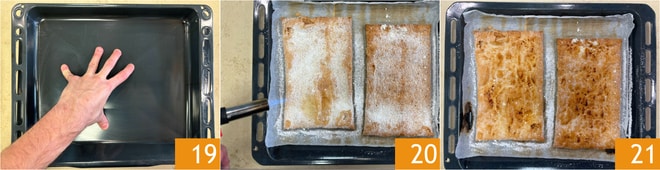 Colocad otra bandeja encima para hacer presión 19 y hornead durante otros 10 minutos; de este modo, el hojaldre no se hinchará. Una vez dorado, sacad del horno y caramelizad el azúcar que quede con un soplete 20, luego dejad enfriar 21.