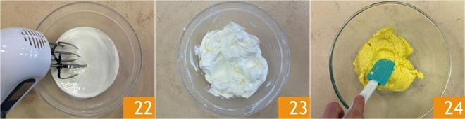 Ahora verted la nata en un bol y trabajad con las batidoras eléctricas 22 hasta que esté montada, pero no demasiado 23. Recuperad la crema pastelera y suavizadla mezclando con una espátula 24.