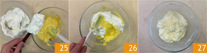 Incorporad la nata semimontada a la crema poco a poco 25 mezclando suavemente de abajo hacia arriba para no desmontarla 26. Transferid la crema diplomática obtenida 27 a una manga pastelera sin boquilla.