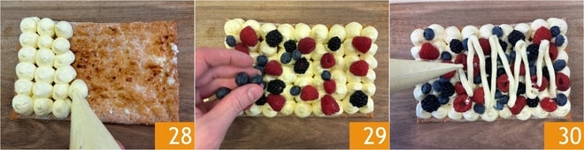 Estáis listos para montar el milhojas: colocad la primera lámina de hojaldre en el plato de servir y cubridla con montoncitos de crema diplomática 28, luego añadid la mitad de los frutos del bosque 29. Rellenad con un poco más de crema 30.