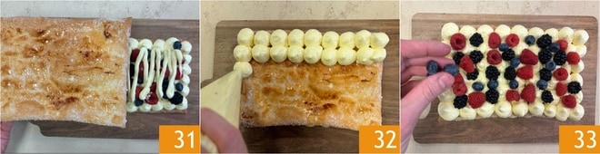 Colocad encima la segunda lámina de hojaldre 31 y cubrid también esta con montoncitos de crema 32, luego distribuid la otra mitad de los frutos del bosque 33.