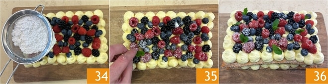 Finalmente, espolvoread con azúcar glas 34 y decorad con hojitas de menta 35. ¡Vuestro milhojas con frutos del bosque está listo para ser servido 36!