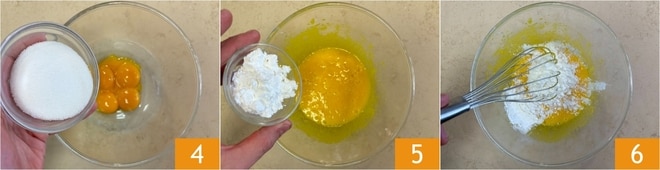 En un bol aparte, verted las yemas y el azúcar 4, batid con un batidor de varillas, luego añadid la fécula de maíz 5 y mezclad nuevamente 6.