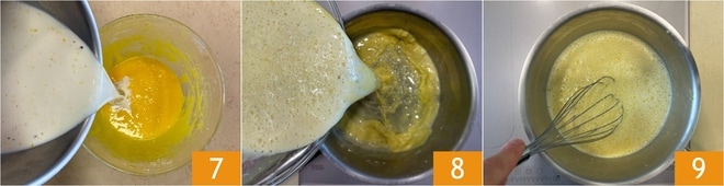 Añadid la leche caliente a la mezcla de yemas en 2 veces 7, luego transferid nuevamente todo al cazo 8 y dejad hervir a fuego lento, removiendo siempre con el batidor 9.