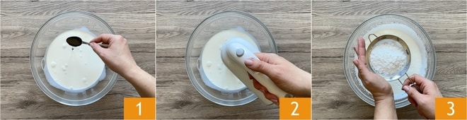 Para preparar el milhojas de fresas, lo primero que hay que hacer es verter la nata en un bol y añadir el extracto de vainilla 1. Comenzad a montar con las varillas eléctricas 2 y cuando empiece a espesarse, añadid el azúcar glas tamizándolo 3.