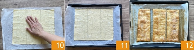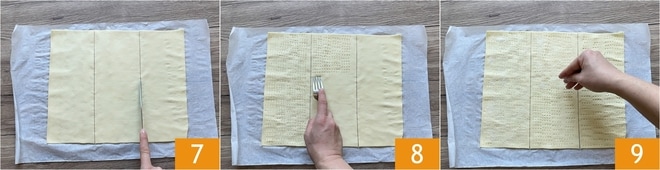 Cortad la masa en el lado más largo, para obtener 3 rectángulos del mismo tamaño 7. Pinchad la masa con los dientes de un tenedor 8 y espolvoread con abundante azúcar 9.