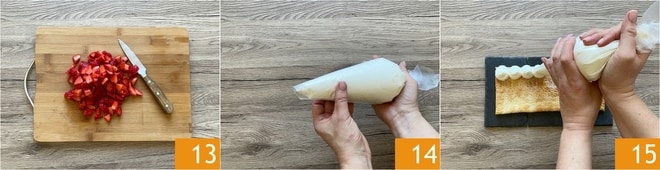 En este punto, lavad bien las fresas y reservad 4 enteras para la decoración final. Eliminad el tallo de las demás y cortadlas en cubos 13. En cuanto la crema esté bien reposada, transferidla a una manga pastelera. Podéis utilizar una boquilla lisa o simplemente cortar la punta de la manga pastelera 14. Tomad una de las bases de hojaldre y colocadla en un plato de servir. Colocad montones de crema por toda la superficie 15.