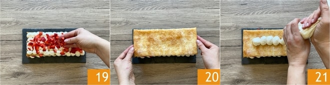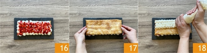 Añadid la mitad de las fresas 16 y cubrid con la segunda base de hojaldre 17. Realizad otra capa de crema, utilizando siempre la manga pastelera 18.