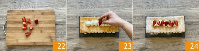 Recoged las fresas que habíais reservado y cortadlas por la mitad 22. Utilizadlas para decorar el milhojas colocándolas sobre los montones de crema 23. Espolvoread el milhojas de fresas con azúcar glas 24 y guardad en el frigorífico hasta el momento de disfrutarlo.