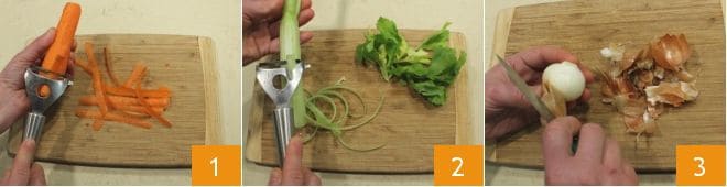 Para realizar la milhojas de cotechino y lentejas comienza preparando las verduras: lava, corta y pela una zanahoria 1, lava, corta el apio y elimina los filamentos más externos 2, pela la cebolla 3, luego reserva las verduras.
