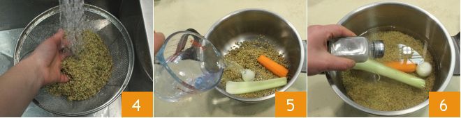 Ocúpate de las lentejas: lávalas bajo el agua corriente 4 y colócalas dentro de una olla a presión junto con las verduras, vierte agua de manera que cubra las lentejas 5, añade sal y pimienta 6