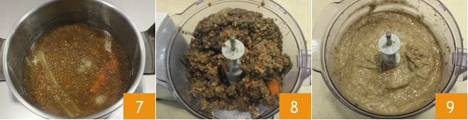 cierra la olla y cocina durante 12-15 minutos y luego déjalas enfriar. Si no usas la olla a presión, pon a remojar las lentejas en agua durante al menos 2 horas para ablandarlas antes de la cocción que requerirá unos 40 minutos. Cuando las lentejas estén blandas 7, déjalas enfriar, colócalas en la batidora 8 y mézclalas hasta obtener una crema homogénea 9.