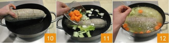 Ahora prepara el cotechino: colócalo en una cacerola amplia 10 y cúbrelo con agua, añade las verduras cortadas en trozos 11, pincha el cotechino con un palillo de madera para permitir que la grasa salga durante la cocción 12;