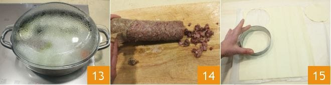 cubre la carne con la tapa 13 y cocina a fuego medio durante aproximadamente 2 horas. Una vez cocido, saca el cotechino, quítale la piel y desmenúzalo 14. Desenrolla el hojaldre, con un cortapastas de aproximadamente 11 cm de diámetro corta círculos de masa 15 y colócalos en una bandeja cubierta con papel de horno.