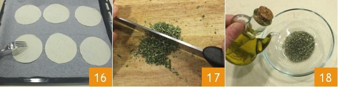 Pica la masa con las púas de un tenedor 16 para evitar que se infle demasiado durante la cocción. Pica finamente las hojas de romero 17, colócalas en un bol pequeño y añade el aceite de oliva 18